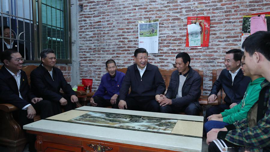 10月22日至25日,中共中央总书记、国家主席、中央军委主席习近平在广东考察。这是10月23日下午,习近平在英德市连江口镇连樟村贫困户陆奕和家,同他们亲切地拉家常。新华社记者 鞠鹏摄